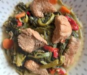 Χοιρινό με σέλινα, πράσα και κόκκινες πιπεριές σε αυγολέμονοΈνα πραγματικά εξαιρετικό πιάτο γεμάτο θεσπέσιες γεύσεις και υπέροχα αρώματα.Ένα πιάτο με χοιρινό κρέας και αρκετά λαχανικά με προεξέχουσα θέση το σέλινο.Η έντονη γεύση και το μεθυστικό άρωμα του σέλινου συνδυάζεται ιδανικά με το χοιρινό κρέας και τα υπόλοιπα λαχανικά, με το αυγολέμονο να αποθεώνει το αποτέλεσμα. Χοιρινό με σέλινα, πράσα και κόκκινες πιπεριές σε αυγολέμονοΥλικά1 και 1/2 κιλό χοιρινό μπούτι σε κομμάτια2 κιλά σέλινα1/2 φλιτζάνι ελαιόλαδο1 κρεμμύδι, ψιλοκομμένο2 πράσα, κομμένα σε ροδέλες2 ... διαβάστε περισσότερα - ΦΥΛΑΚΕΣ ΑΓΓΕΛΟΙ!!!!!!!!!
