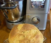 Σήμερα πειραματίστηκα με το νέο μου μίξερ, ένα καταπληκτικό μηχάνημα, έφτιαξα ψωμί χωριάτικο με προζύμι. Μύρισε το σπίτι ψωμί και πραγματικά δεν έμεινε ούτε ψίχουλο!! Τι θα χρειαστούμε:500 γρ. αλεύρι ειδικό για ψωμί150 γρ. φυσικό προζύμι 300-325 γρ. νερό 5 γρ. αλάτι 1/2 κ.σ. ελαιόλαδοΠως γίνεται:Τοποθετούμε στο μπολ του μίξερ το αλεύρι κάνοντας μια λακουβίτσα στο κέντρο. Διαλύουμε στο νερό το αλάτι και προσθέτουμε το ελαιόλαδο, τα ανακατεύουμε ελαφρώς και τα ρίχνουμε στο αλεύρι. Προσθέτουμε το προζύμι. Προσαρμόζουμε το ειδικό εξάρτημα για ψωμιά, το ... διαβάστε περισσότερα - Μοναστηριακή Φανουρόπιτα από την Ιερά Μονή Αγίων Νεκταρίου και Φανουρίου Τρικόρφου Φωκίδος